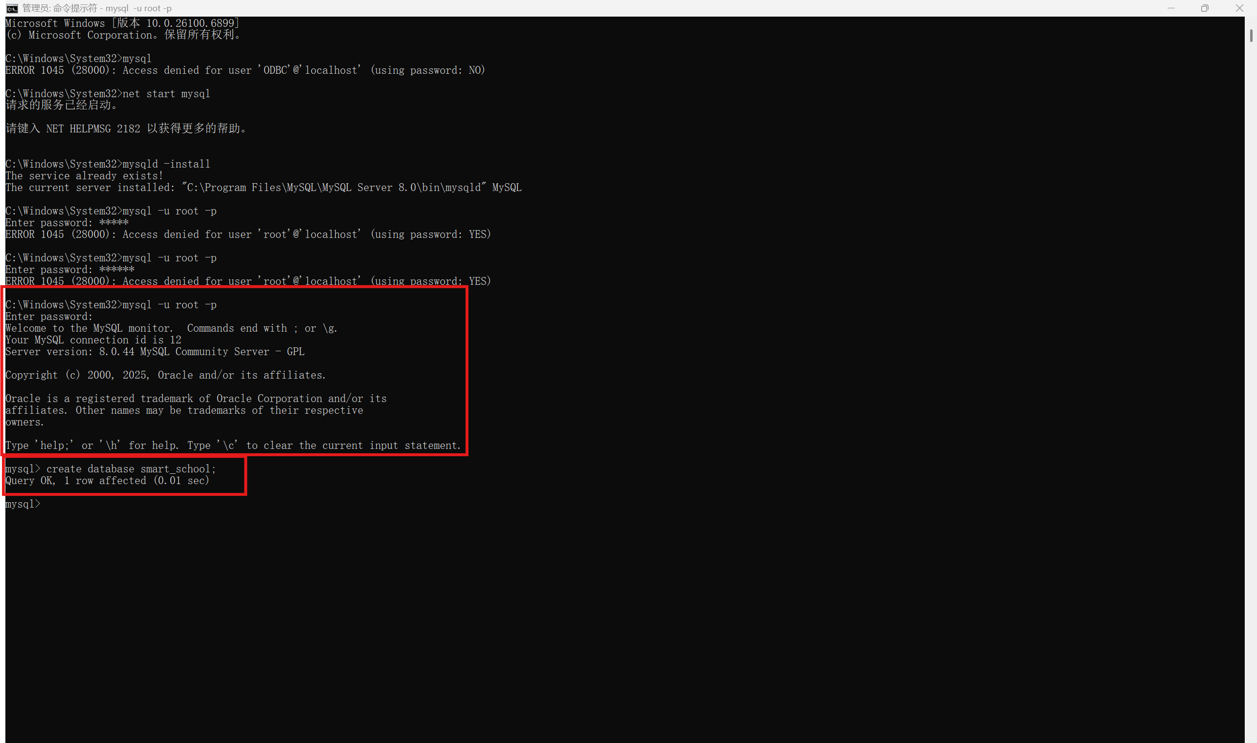 输入create database smart_school; 创建一个数据库(database后的文件名可进行自定义)