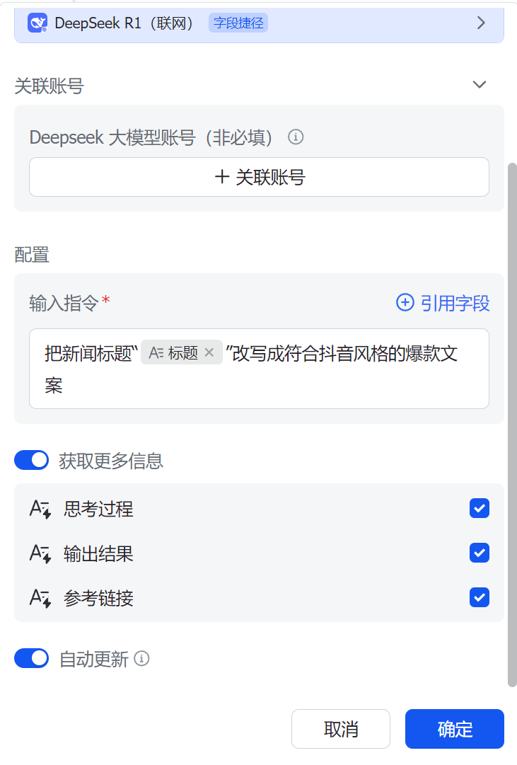 输入指令,并把标题字段引入作为参考,下方还可以获取更多信息包括推理过程以及输出结果等等