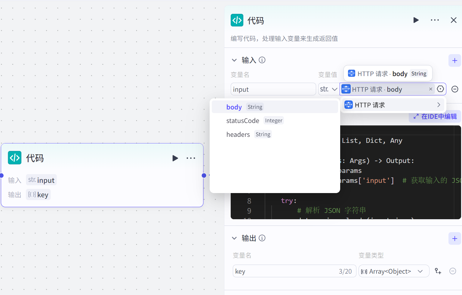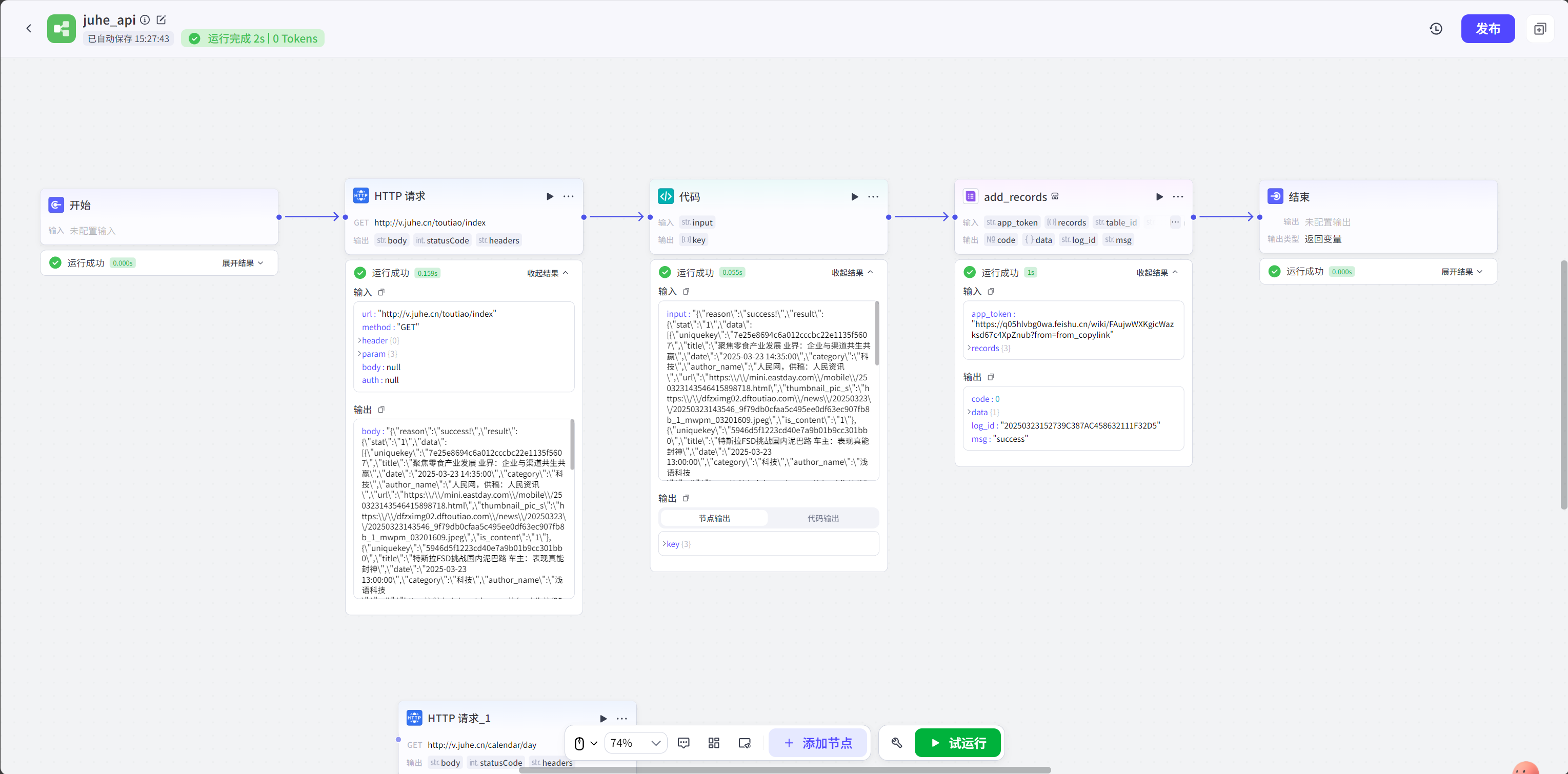 HTTP请求返回的是JSON数据, 飞书多维表格需要数组格式。 怎么办? “代码节点” 闪亮登场! 复制粘贴以下代码, 一键搞定数据格式转换! (看不懂代码? 没关系! 直接用就行!😎)