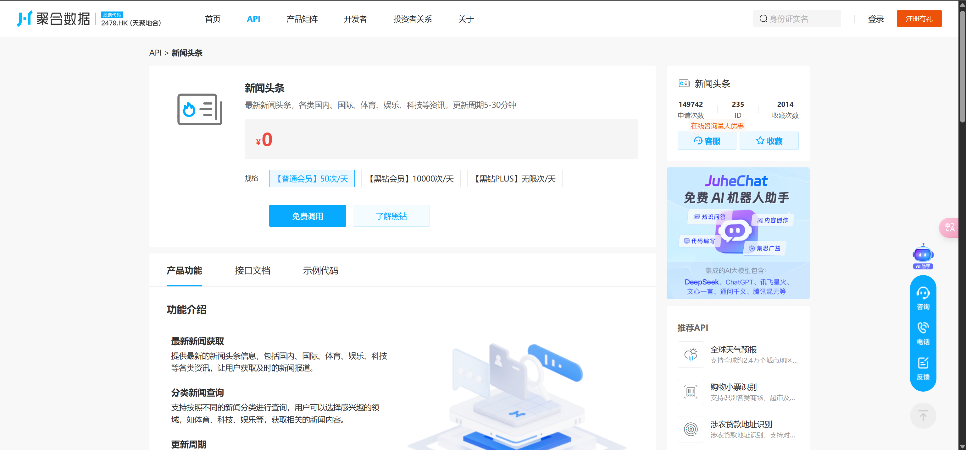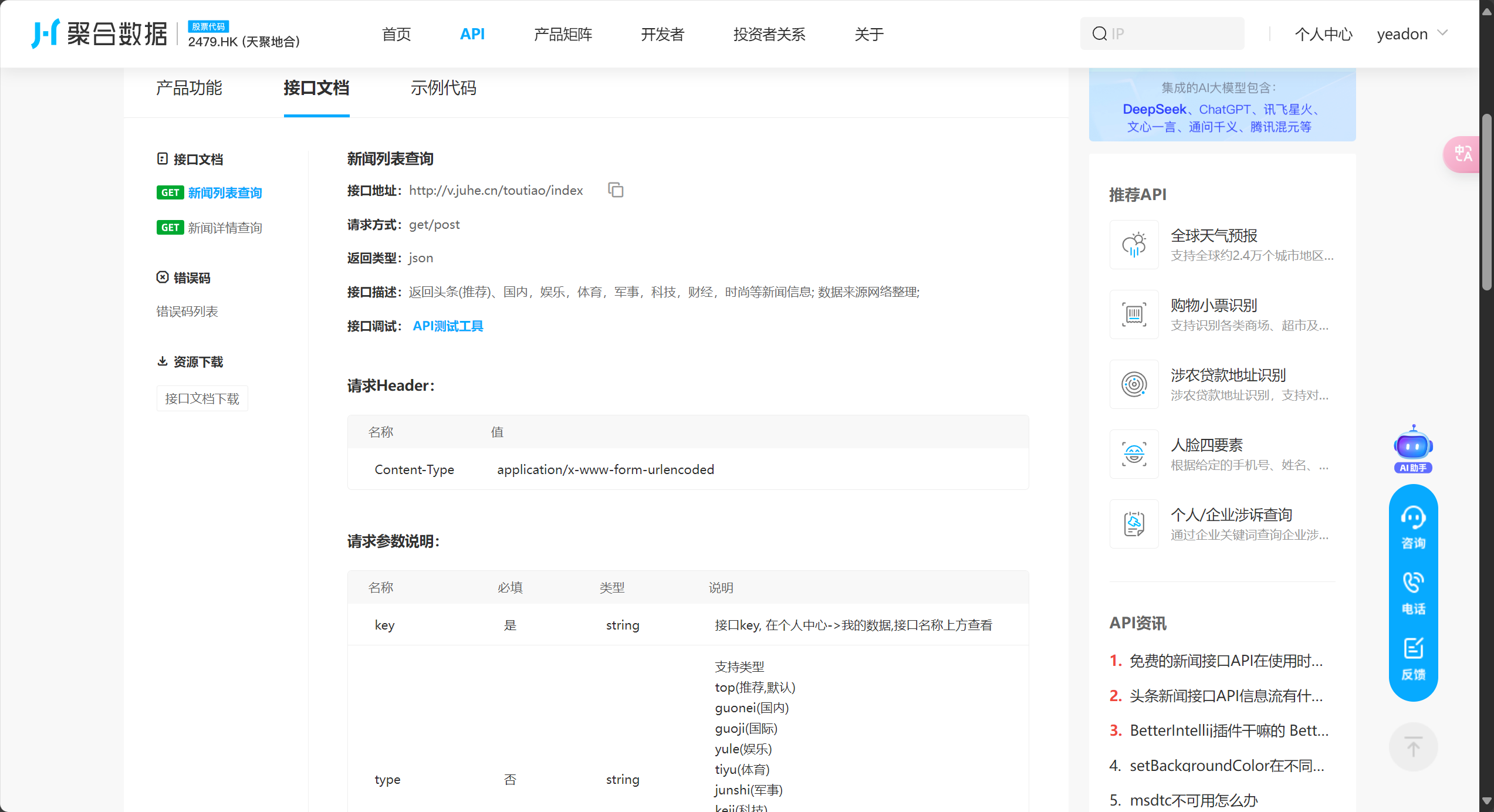 注册登录后, 在API市场搜索 “新闻头条”, 选择 “免费调用”! 每天50次免费额度, 完全够用! 点击 “接口文档”, 仔细阅读, 这里藏着 接口地址、请求方式、参数说明 等重要信息, 划重点! 后面要用到!