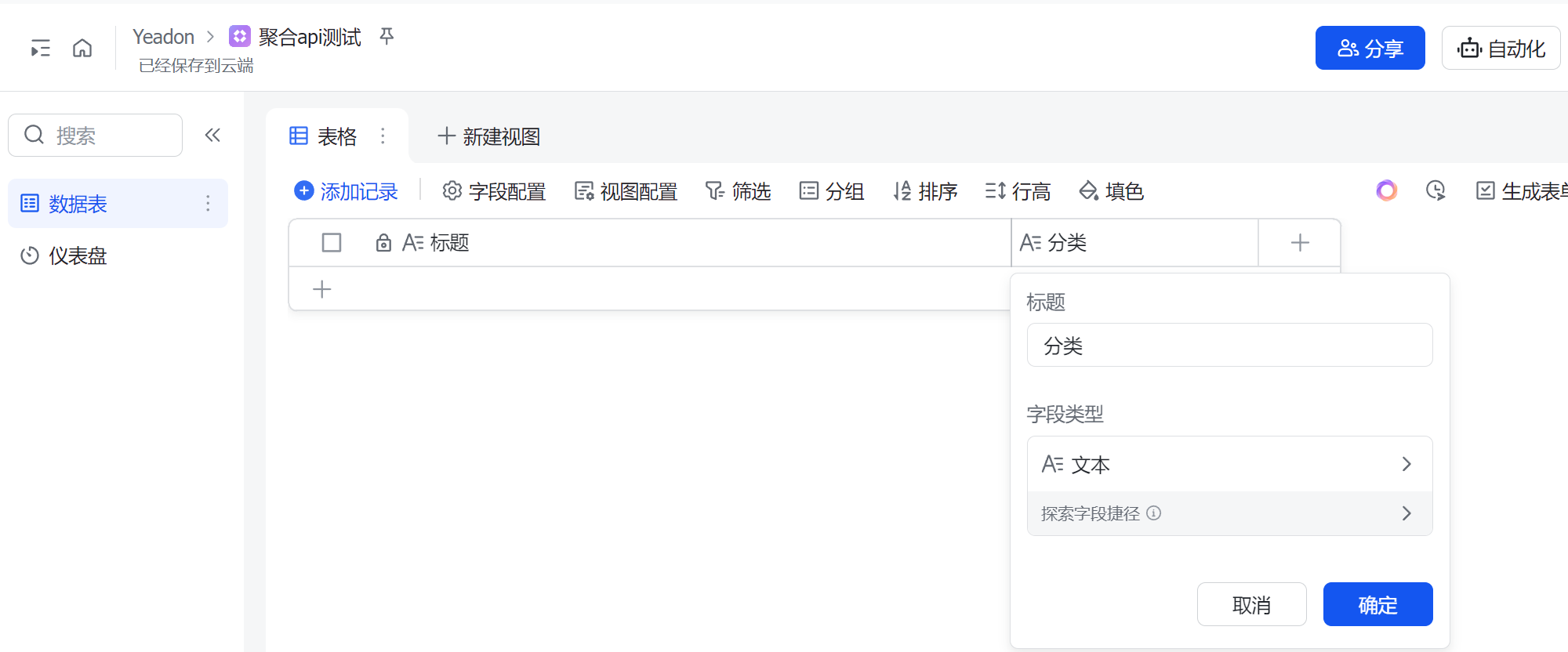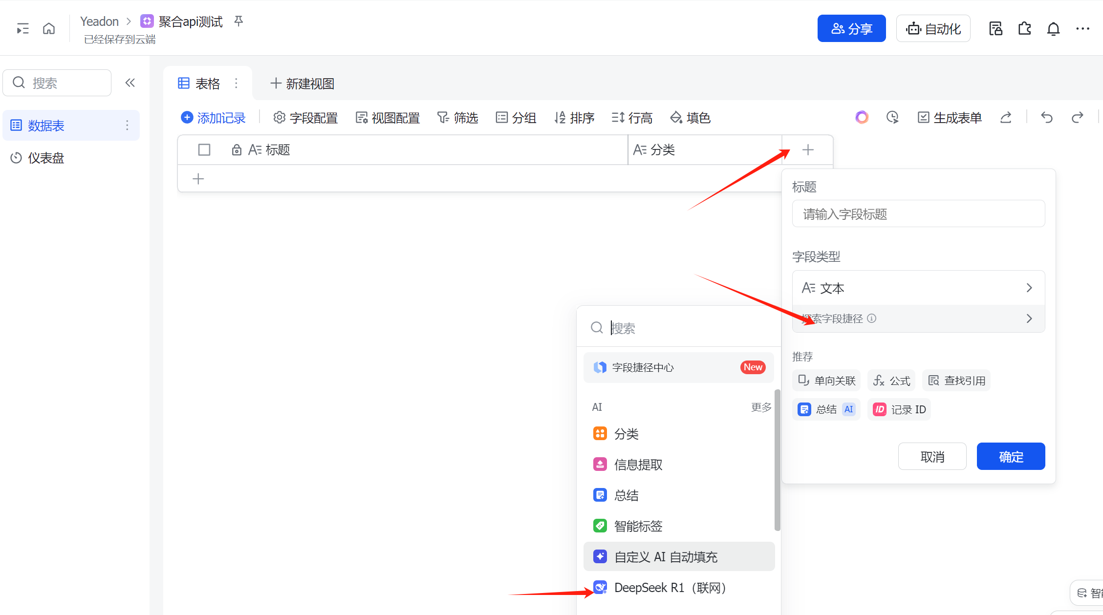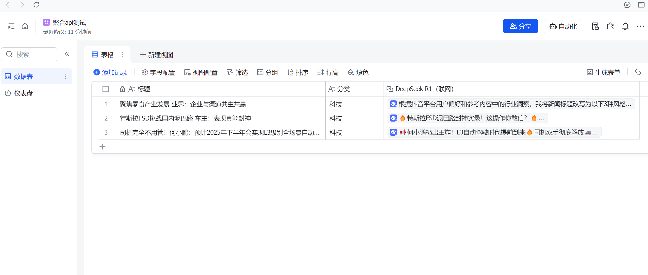 最后一步! 把新闻数据放进飞书多维表格! 在飞书中 新建多维表格, 务必创建 “标题” 和 “分类” 两个文本字段 (重要!和代码节点对应)。 创建完成后, 复制多维表格链接。