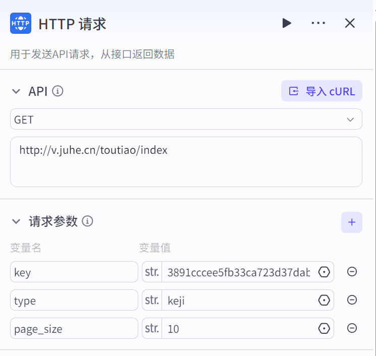 根据接口文档, 请求方式选择 “GET”, 接口地址填入 http://v.juhe.cn/toutiao/index。 重点来了! 请求参数设置!