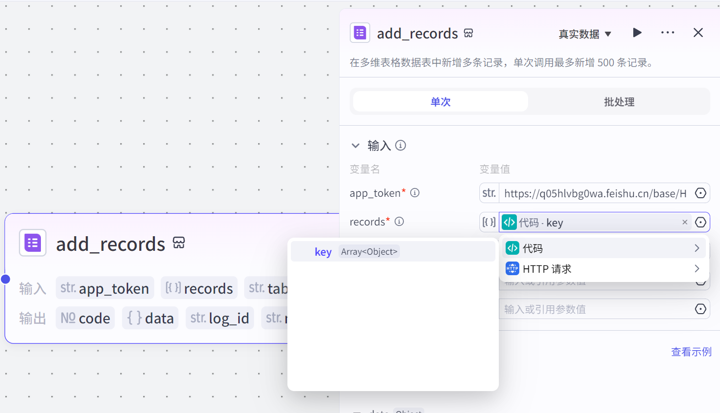 回到Coze工作流, 拖入 “飞书多维表格” 节点, 粘贴刚才复制的 多维表格链接, “Records” 选择 “代码节点” 的 “对象数组输出”。