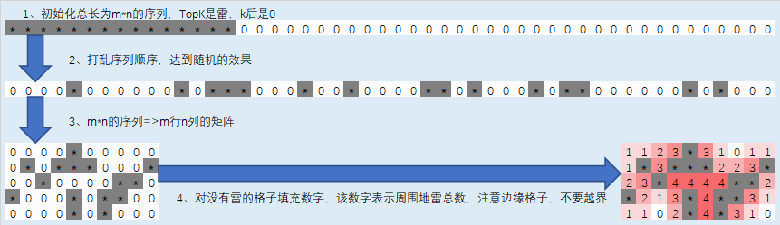 # 初始化总长为m*n的序列,TopK是雷,k后是0