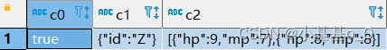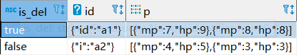 SELECT '{"is_del":true,"id":{"id":"Z"},"p":[{"hp":9,"mp":7},{"hp":8,"mp":8}]}' AS js;