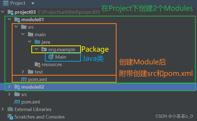 在Module下可以创建多个Package - 在Package下可以创建多个Java类