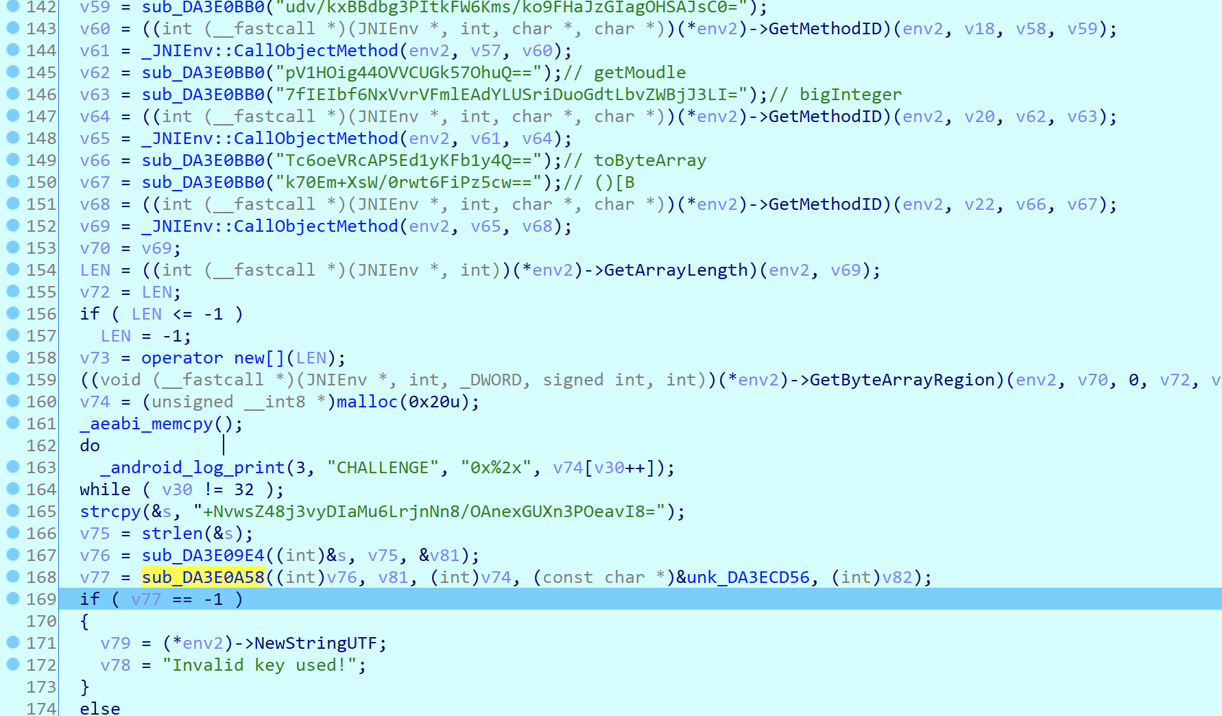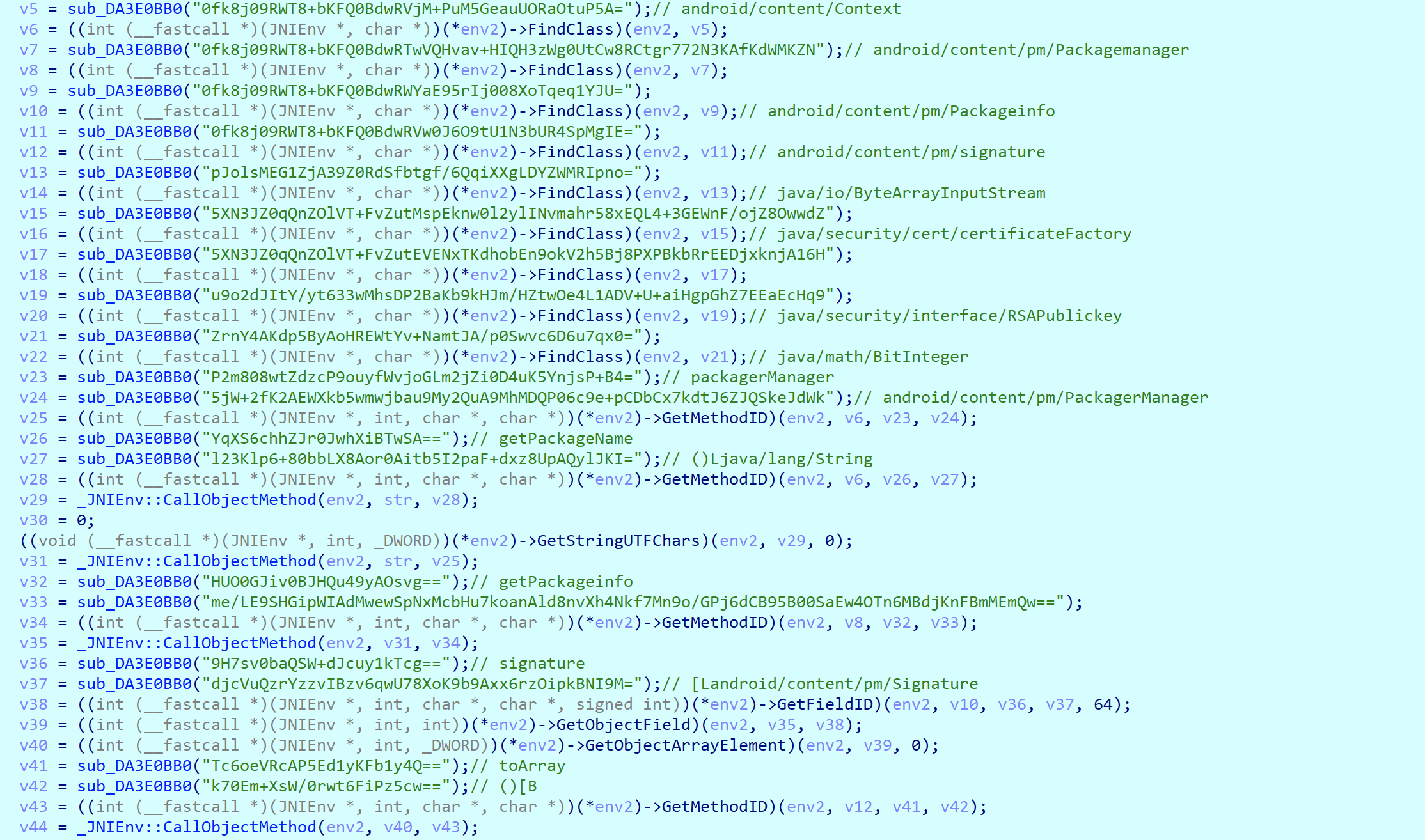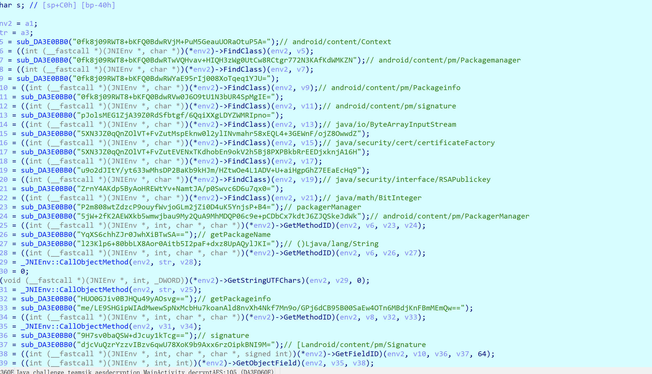 这里其实挺操蛋的,本来java层几行可以解决的问题,在so层就得这么多行。上面一大堆,其实从后面可以看出DA3E0BB0这个函数其实就是做的一个base64加aes解密,这里我也没管,