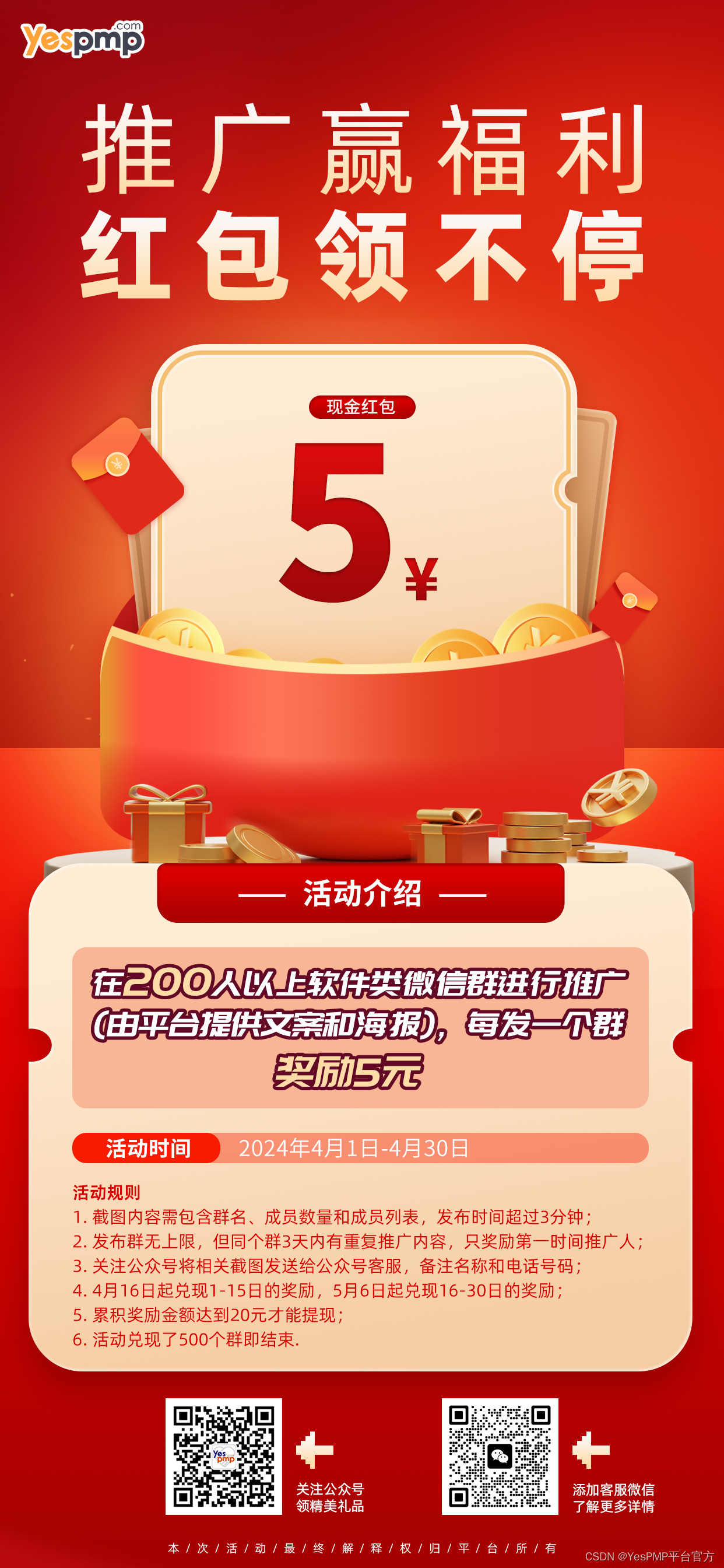 YesPMP微信群推广活动开始啦,转发活动文案+海报到软件微信群(200人以上),就能领取现金红包,动动手指就能拿到,快来呼朋友参与活动吧!