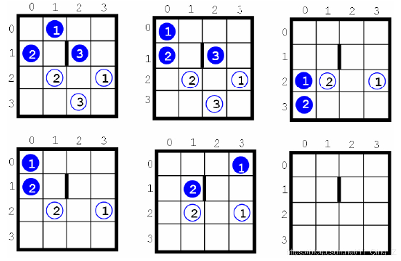 The game is over when each marble has dropped into a hole with the corresponding number. The figure below illustrates a solution for a game played on a 4×4 board with three blue marbles, three holes and a wall. The solution has five moves: lift the east side, lift the north side, lift the south side, lift the west side, lift the north side. Your program should determine the fewest number of moves to drop all the marbles into the correct holes — if such a move sequence is possible.