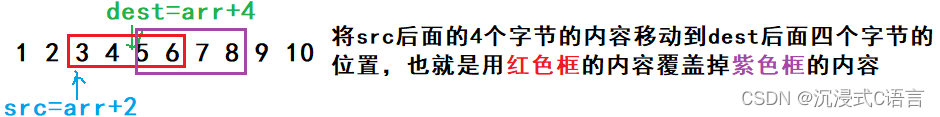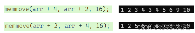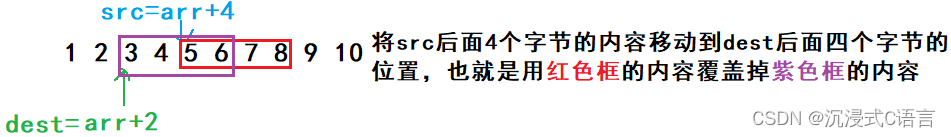这种情况我们就可以先将5移动到3的位置,然后将6移动到4的位置,再将7移动到5的位置,最后将8移动到6的位置,所以结果就是1 2 5 6 7 8 7 8 9 10,这样就实现了内存移动。