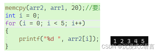 my_memcpy(arr2, arr1, 20);//要注意这里的20单位是字节,一个整形是4个字节,所以就是5个整形