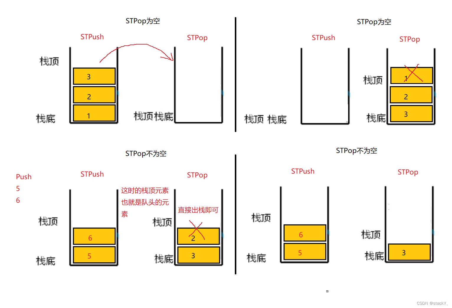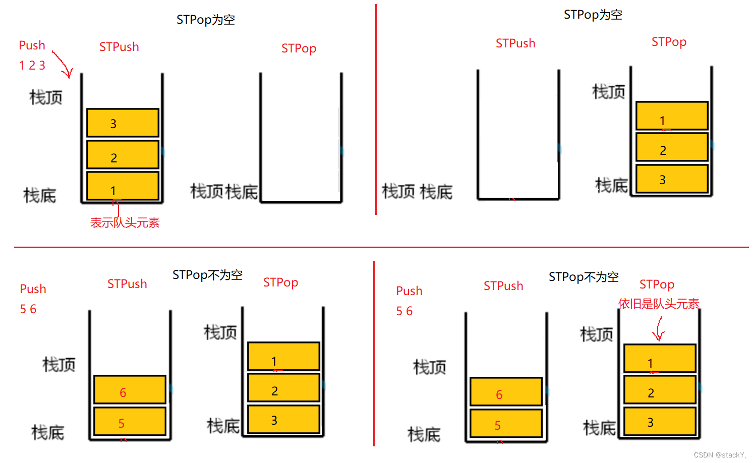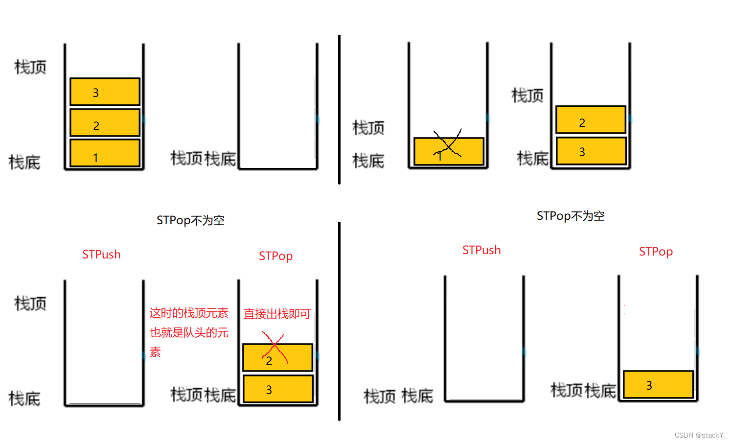 栈的出栈是先进后出,我们有两个栈,因此可以将STPush栈中的前n-1个数据先依次插入到STPop栈中,然后将剩下的最后一个元素,对于队列来说就是队头的数据进行删除即可,但是呢,当第二次删除的时候STPush中没有数据了,这时的STPop中的数据的排列刚好是队列的这种效果,所以可以直接在STPop栈中直接删除即可,所以出列操作需要分两种情况:STPop栈中有无数据