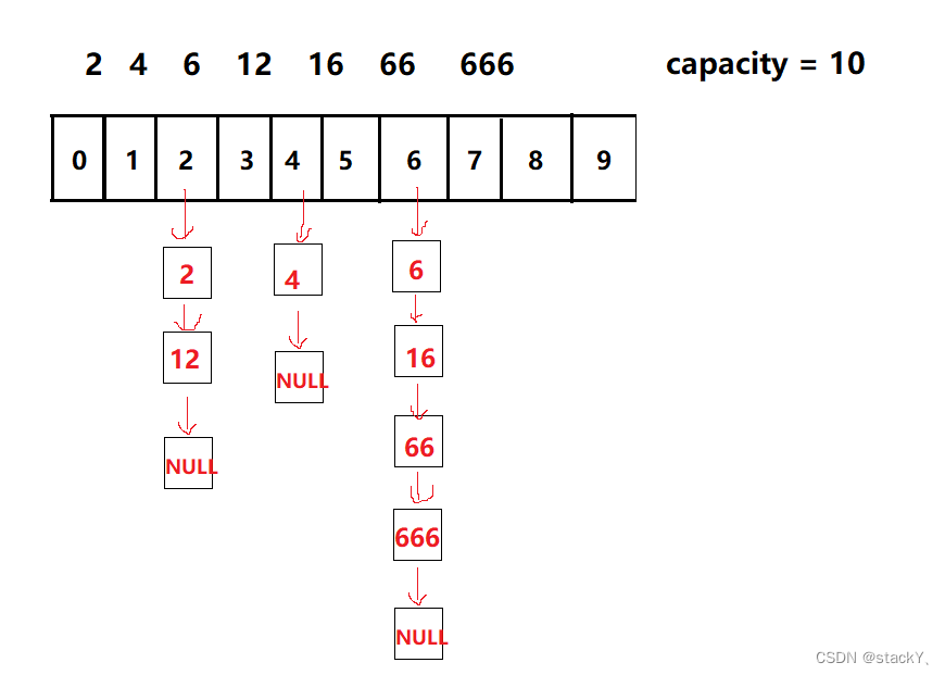 接起来,各链表的头结点存储在哈希表中。从上图可以看出,开散列中每个桶中放的都是发生哈希冲突的元素。