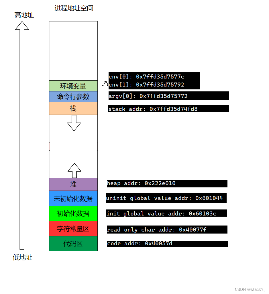 #include <stdio.h> #include <stdlib.h> int un_gval; int init_gval = 100; int main(int argc, char *argv[], char *env[]) { printf("code addr: %p\n", main); // 代码区 const char *str = "HelloLinux!"; printf("read only char addr: %p\n", str); // 字符常量区 printf("init global value addr: %p\n", &init_gval); // 已初始化全局数据区 printf("uninit global value addr: %p\n", &un_gval); // 未初始化全局数据区 char* heap = (char*)malloc(100); printf("heap addr: %p\n", heap); // 堆区 printf("stack addr: %p\n", &str); // 栈区 int i = 0; for(i = 0; argv[i]; i++) { printf("argv[%d]: %p\n",i, argv[i]); // 命令行参数 } for(i = 0; env[i]; i++) { printf("env[%d]: %p\n",i, env[i]); // 环境变量 } return 0; }