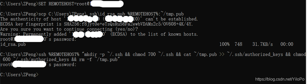 下面是我的实际输出,打码部分为IP地址,用自己远程机器的IP替换即可。yes/no时输入yes,密码为root用户的登录密码。