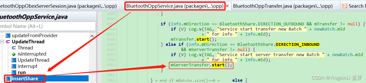 -->通过log “Service start server transfer new Batch”倒推到类BluetoothOppService中方法insertShare执行的“mServerTransfer.start();”