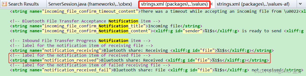 ---基于显示特定格式“Bluetooth share: Received”, 我们找到其对应的资源为