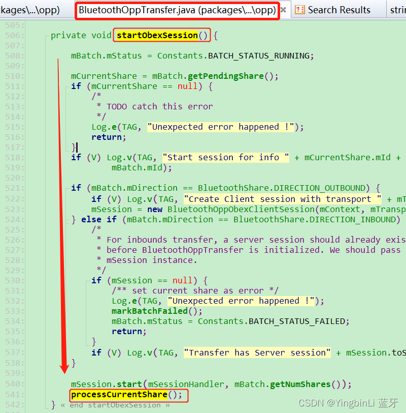 -->通过实际log倒推到类BluetoothOppTransfer中方法 startObexSession中调用processCurrentShare;