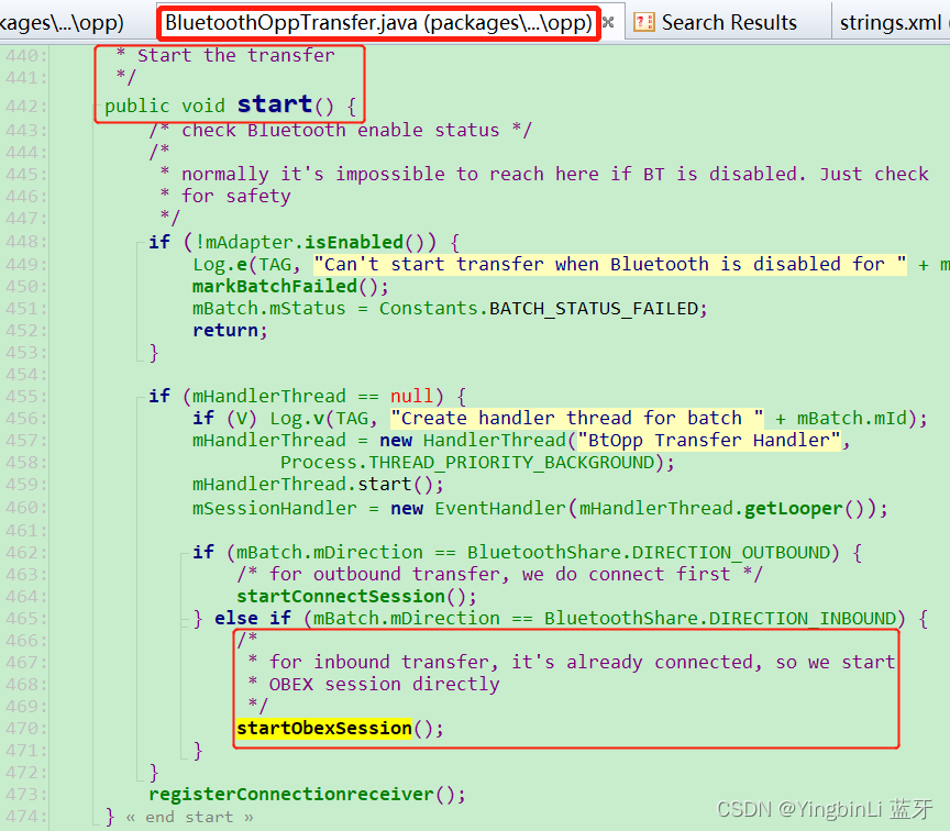 -->通过Log “Create handler thread for batch”倒推到BluetoothOppTransfer中方法start执行startObexSession;