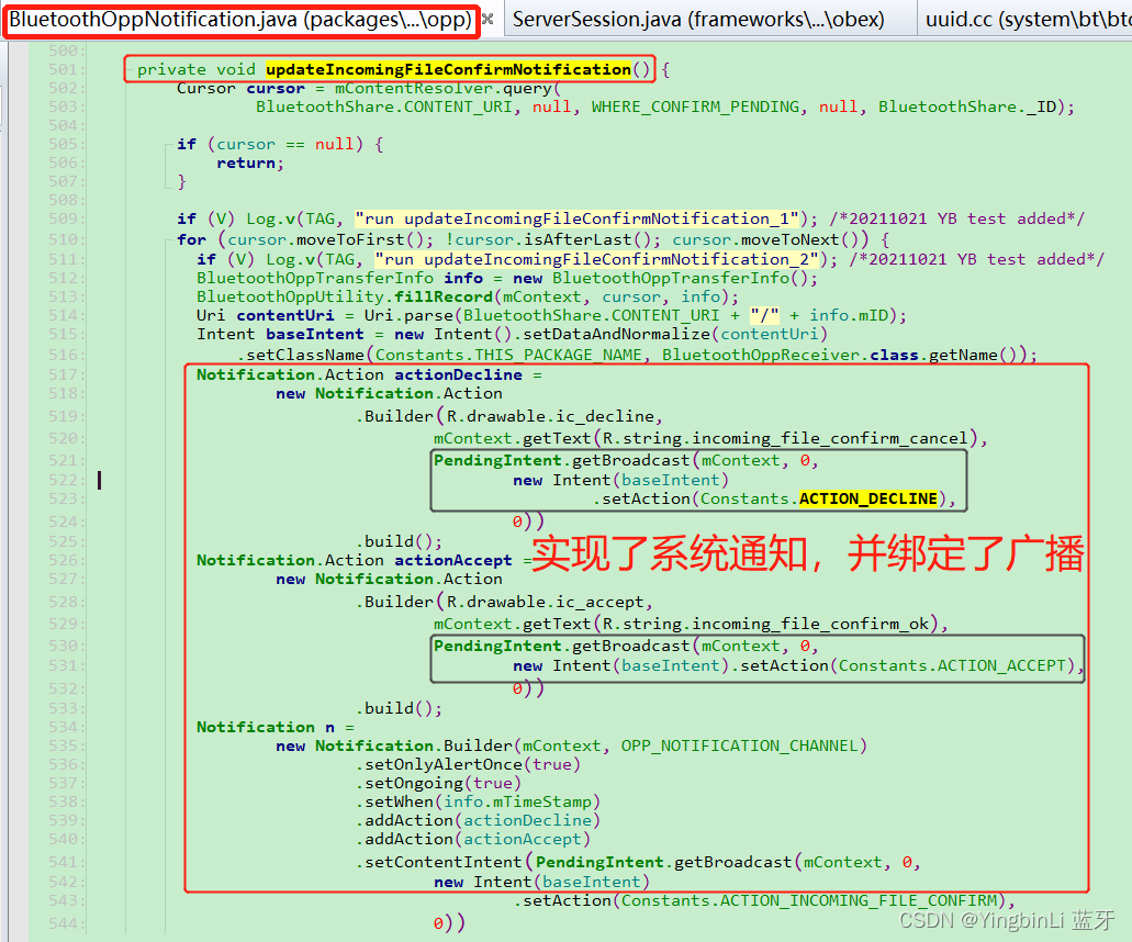 ” getContentResolver().insert(BluetoothShare.CONTENT_URI”写入了URI中;然后在监听线程BluetoothShareContentObserver中的方法onChange执行updateNotification 发出