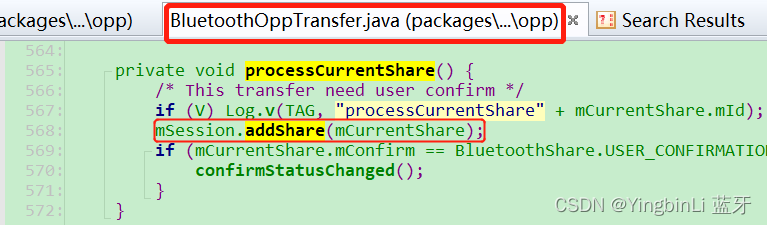 -->倒推到类BluetoothOppTransfer中方法processCurrentShare调用addShare;