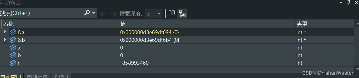 在调试的可以观察到,x和y确实得到了a和b的值,但是x和y的地址和a和b的地址是不⼀样的,所 以我们可以理解为形参是实参的⼀份临时拷⻉。