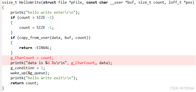 ssize_t HelloWrite(struct file *pFile, const char __user *buf, size_t count, loff_t *pos)