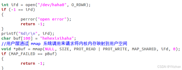 以下是一个简单的内存映射示例,展示了如何在内核驱动中实现 mmap 接口,并将内核内存映射到用户空间。