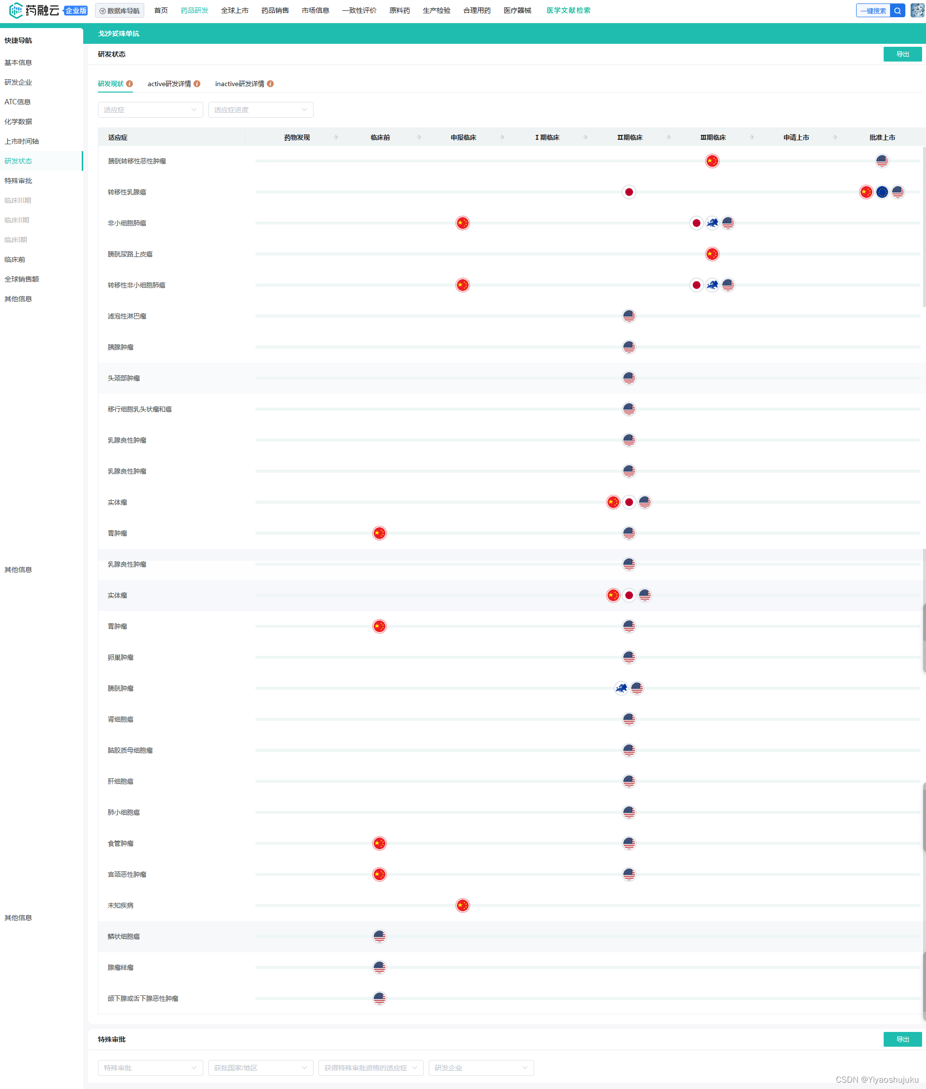 可查看到目标药物的基本信息、研发企业、ATC信息、化学数据、上市时间轴、研发状态、特殊审批、临床Ⅰ、Ⅱ、Ⅲ期信息、全球销售额和其它信息等,上图中的研发状态就包含了目标药物各个适应症在各国的批准的时间&状态。