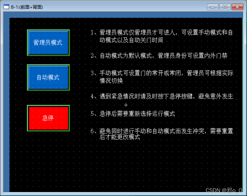 本设计运用到软件GX_Works2和GT_Designer3,能实现内外门禁功能,自动关门,手动关门功能和管理员模式功能。