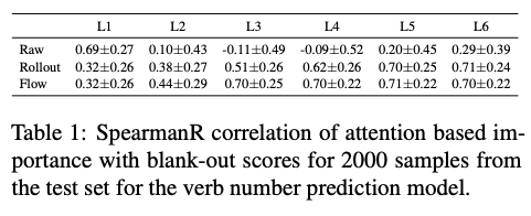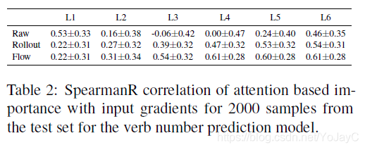 作者使用输入消融法,blank-out方法来估计每个输入token的重要性。Blank-out用UNK逐个替换输入中的每个token,衡量其对预测正确类别的影响程度。接着计算网络最后一层类别Embedding的attention权重和blank-out方法算出的重要性得分之间的Spearman秩相关系数,发现除了第一层之外,其他层的相关系数都很低,证实了前述文章中的观点。从表2可知,输入梯度和重要性得分之间的Spearman秩相关系数同样也很低。