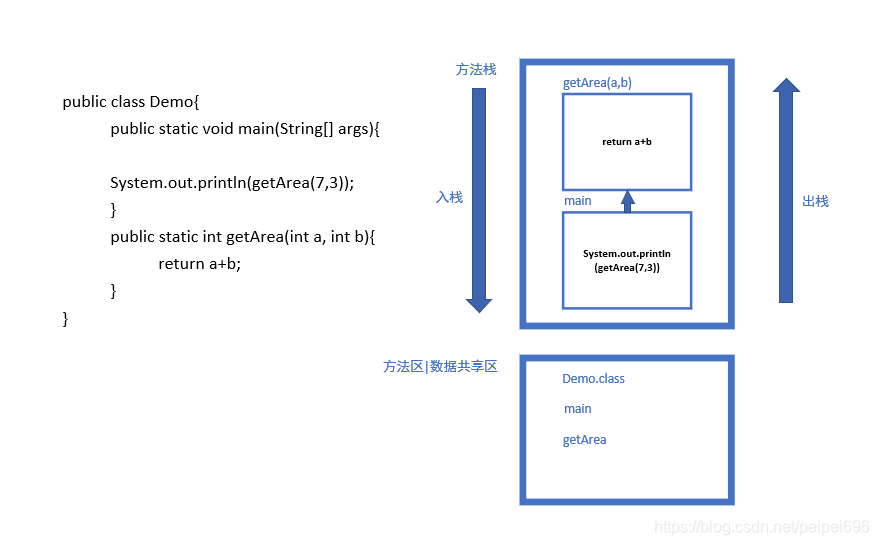 程序要用行,先把class文件加载到内存方法区中,jvm默认调用主方法(main)方法进栈运行,逐行执行主方法里的代码,运行到getArea(7,3),调用getArea(int a, int b)方法,然后此方法入栈执行,把实参7,3赋值给方法,执行方法中的代码return a+b,把getArea()的返回值返回给main方法,getArea()方法执行完出栈,然后继续执行main方法输出打印,主方法执行完,弹栈释放内存。