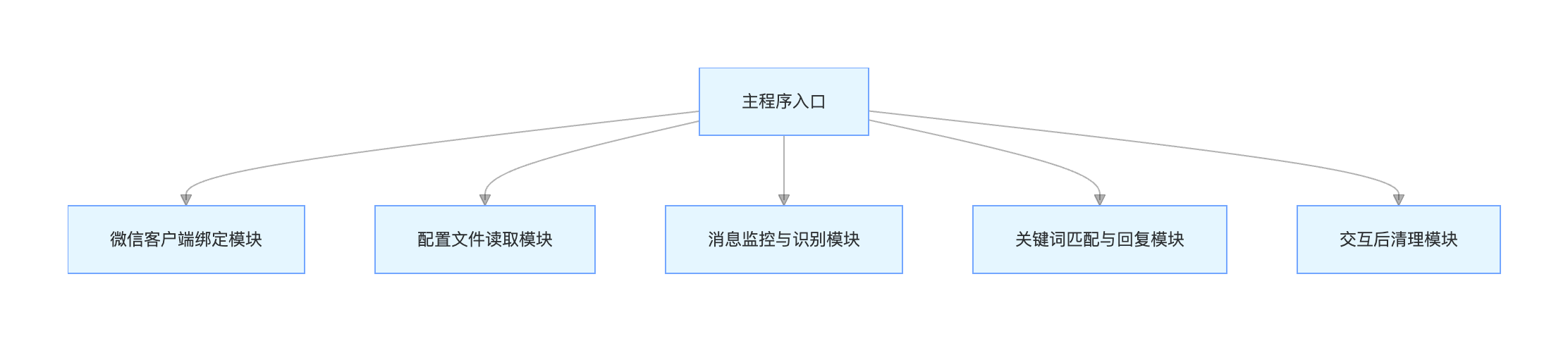 各模块的依赖关系:微信客户端绑定 是基础,配置文件读取 是配置来源,消息监控与识别 是触发条件,关键词匹配与回复 是核心业务,交互后清理 是体验优化。