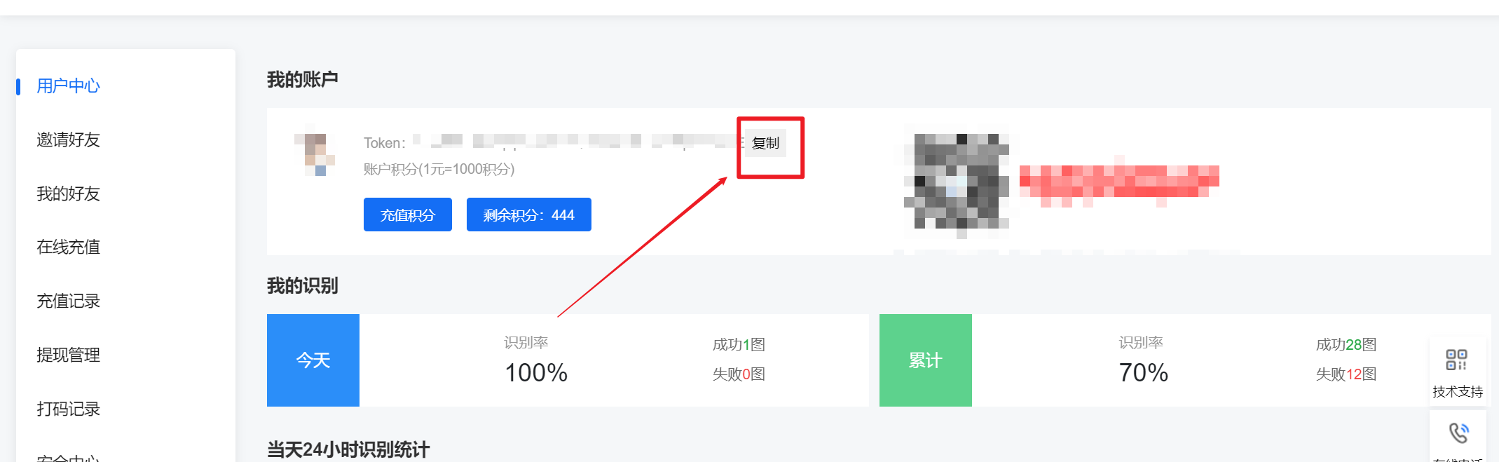 注册完成领取积分后点击右上角头像进入个人中心,找到token点击复制