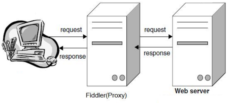 此时,fiddler就作为代理服务器,浏览器访问87testing.com的流程:浏览器给webserver发送一个Request,代理服务器fiddler接收到Request,fiddler将Request发送到webserver,webserver接收到Request后进行处理,Response到代理服务器fiddler,Fiddler将Response返回到浏览器,如下图: