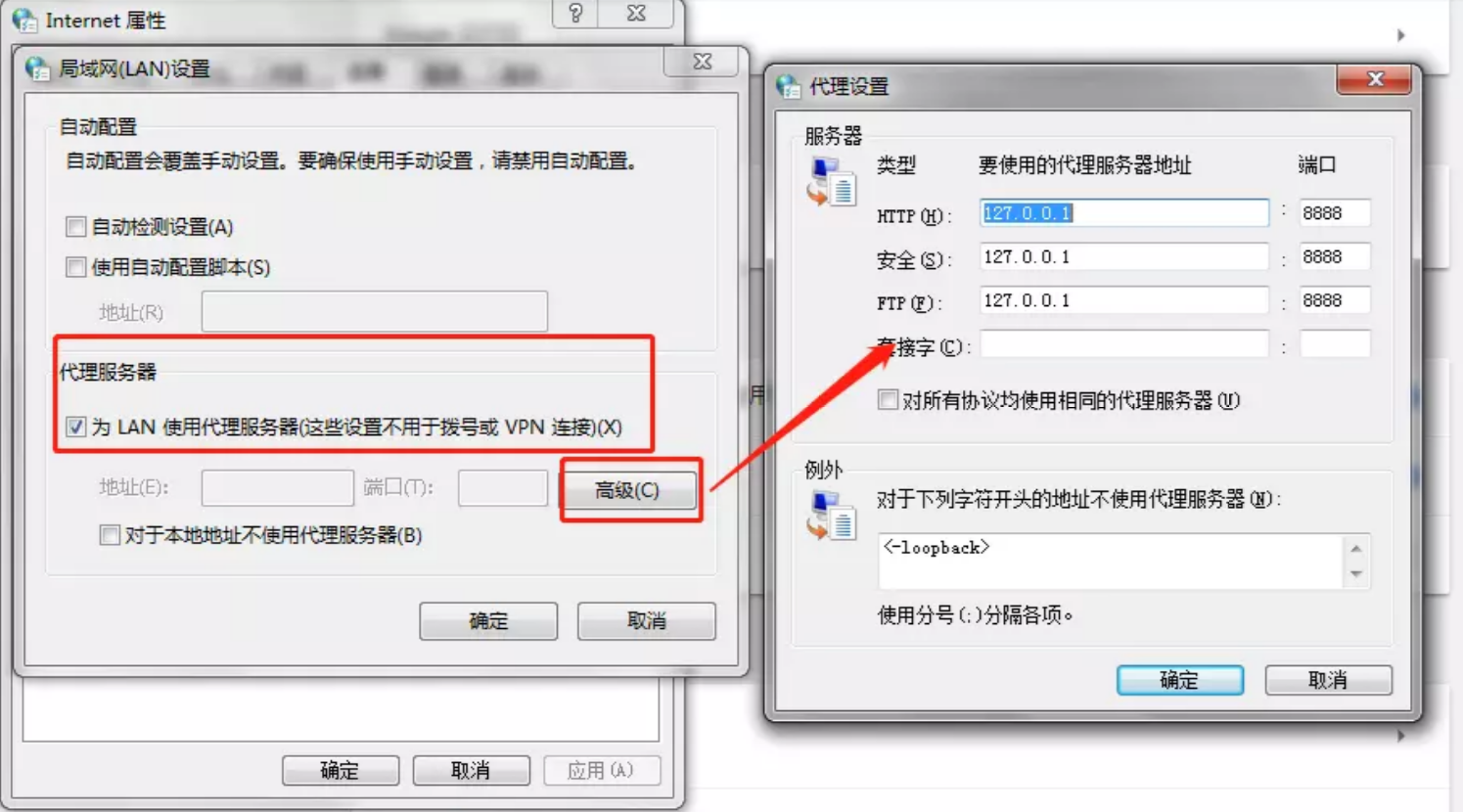 Fiddler工作于七层中的应用层,在client与webserver之间以代理服务器的形式存在,启动fiddler后会监听本地127.0.0.1的8888端口(默认端口),IE/Chrome浏览器会自动设置局域网代理(Firefox代理是独立的,需要单独设置),如下图: