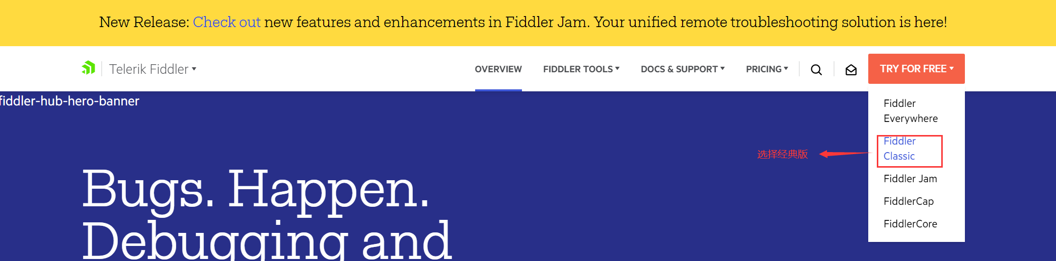 1、打开官网地址选择TRY FOR FREE选择Fiddler Classic(经典版);如下图