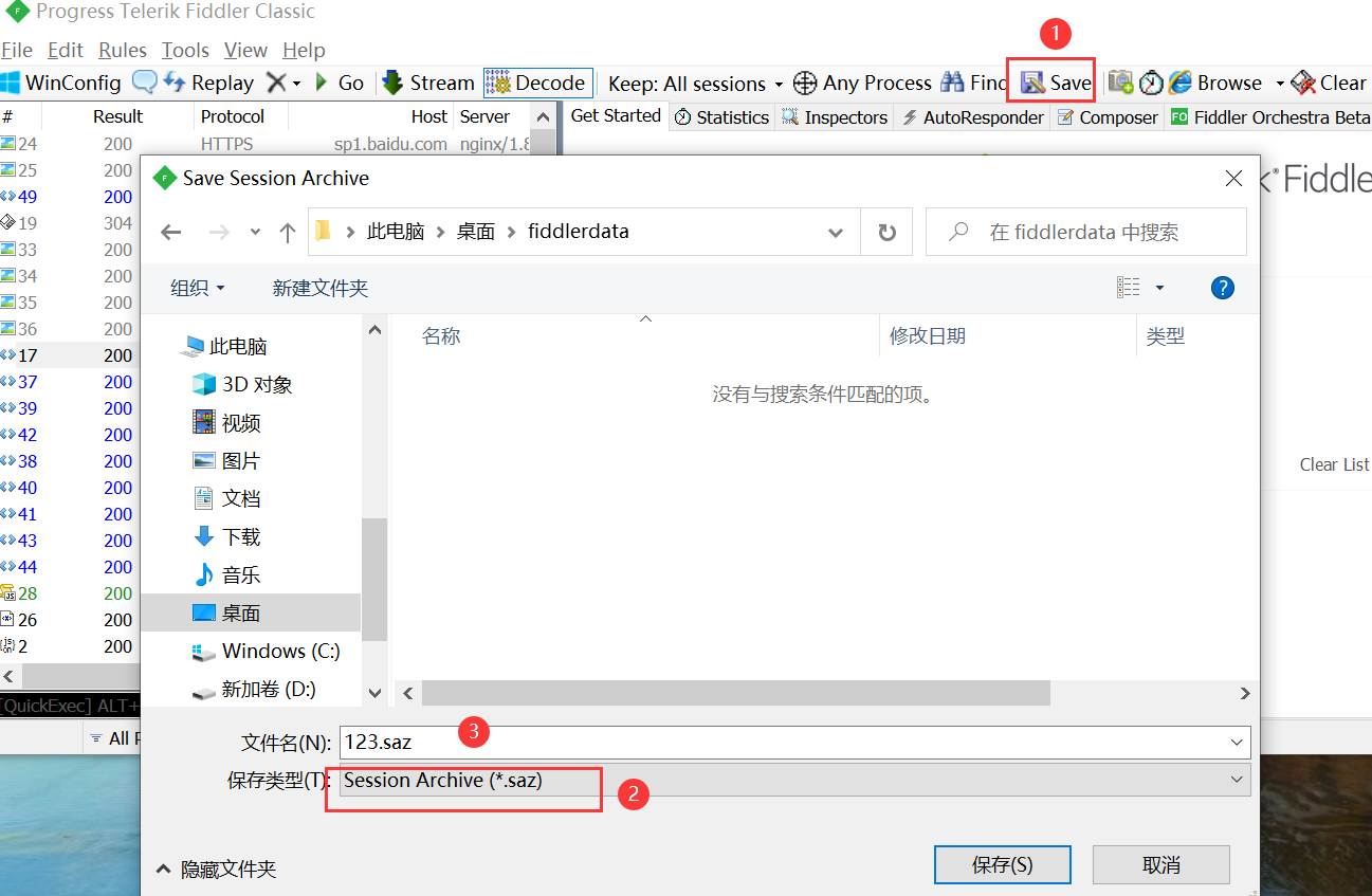 (11)Save:保存按钮可以对捕获到的会话进行保存。保存后只需要把保存的saz文件打开即可