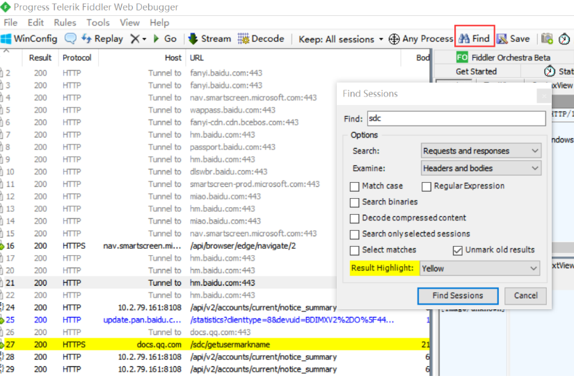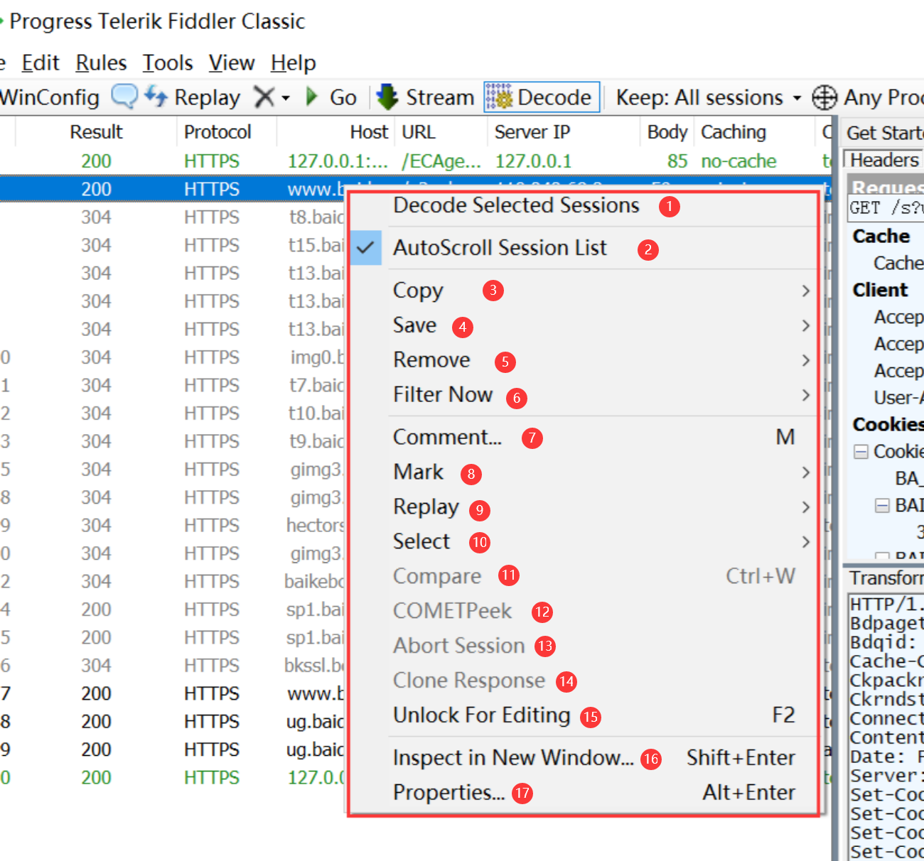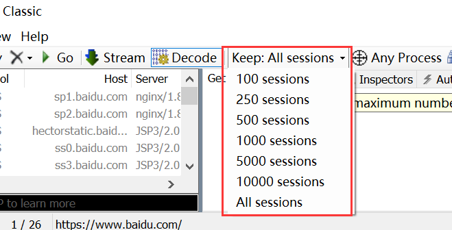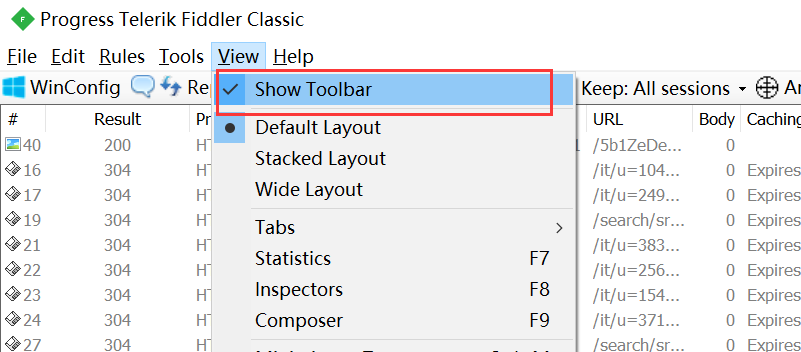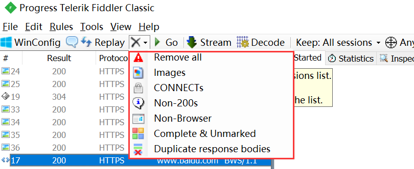 (8)Keep All Sessions:Fiddler默认保存 All sessions,需要注意的是Fiddler保存的会话状态越多,占用的内存越大。如果性能不是特别好,建议不要保存所有会话