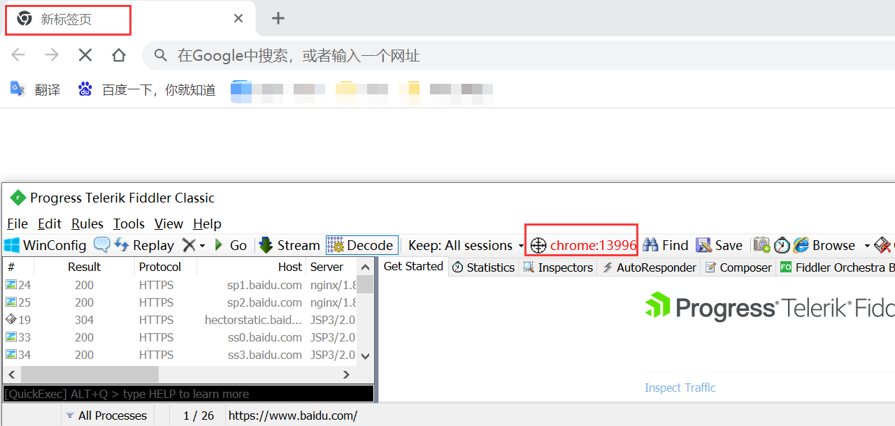 (9)Any Process:过滤请求(靶心形状按钮是帮我们过滤不想看到的进程发出的请求,只保留我们要看到的进程的请求。方法是比如只想看到谷歌浏览器请求,把靶心拖动到谷歌浏览器放开即可。)该功能可以只捕获某个客户端或进程发送的请求,点击Any Process拖动鼠标到指定客户端或者进程上。