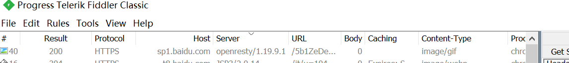 上图找过你该状态栏箭头向下,表示Fiddler拦截请求回来的时候。放行断点的时候单击上方的GO的按钮即可。