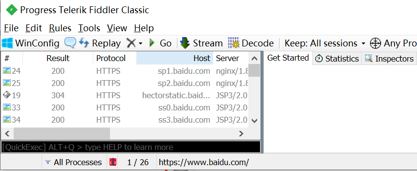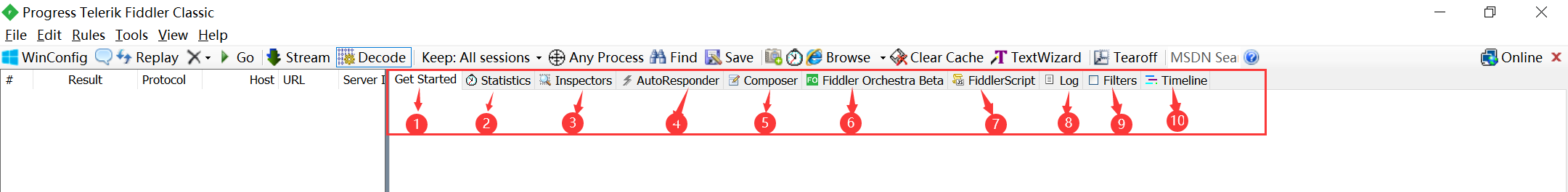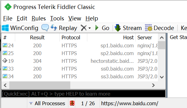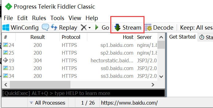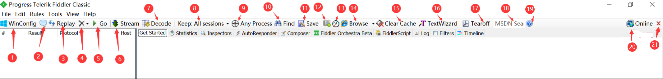 (2)Capturing:此处与菜单栏中 File→Capture Traffic 效果是一致的,默认底端状态栏此处是有 Caturing,有它才表示 fiddler 捕获请求