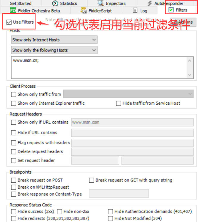 Show only traffic from :只显示指定客户端的请求,右侧有当前的 Windows 进程可选择