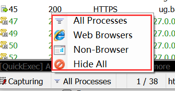 (3)All Processes:这里有 All Processes,Web Browsers,Non-Browser,Hide All 几个选项,这个几个选项顾名思义,但要注意的是这些不是筛选当前 session 框中的 session,而是选中需要筛选的状态之后,后面的请求会按照此状态来筛选;