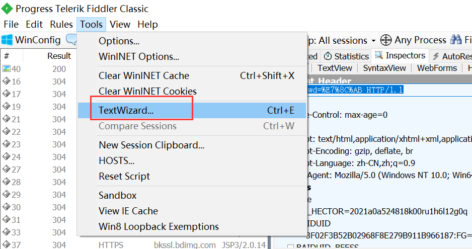 (1)WinConfig:windows 使用了一种叫做“AppContainer”的隔离技术,使得一些流量无法正常捕获,在 fiddler中点击 WinConfig 按钮可以解除这个诅咒,这个与菜单栏 Tools→Win8 Loopback Exemptions 功能是一致的