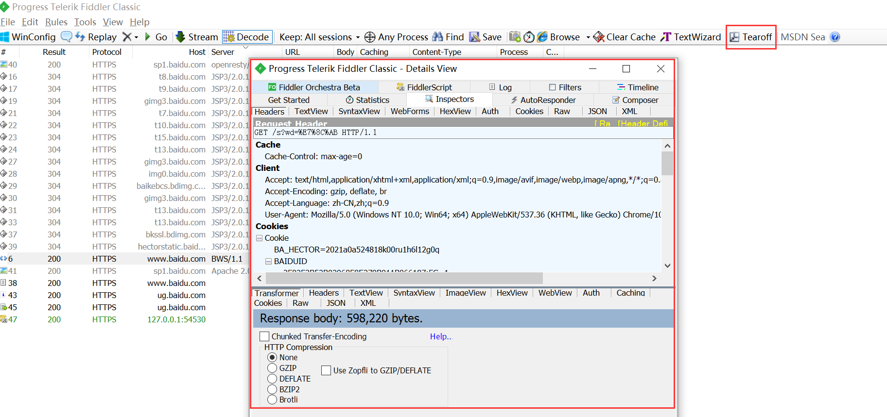 (17)Tearoff:此功能用来将右边栏里的请求和响应部分给单独拆成一个新窗口,方便视察