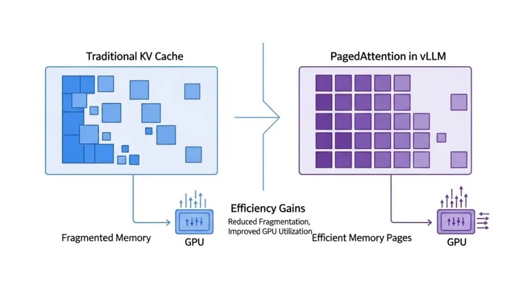 A comparison diagram illustrating the memory layout and efficiency gains of traditional KV Cache versus PagedAttention in vLLM, showing reduced fragmentation and improved GPU utilization for large language models.