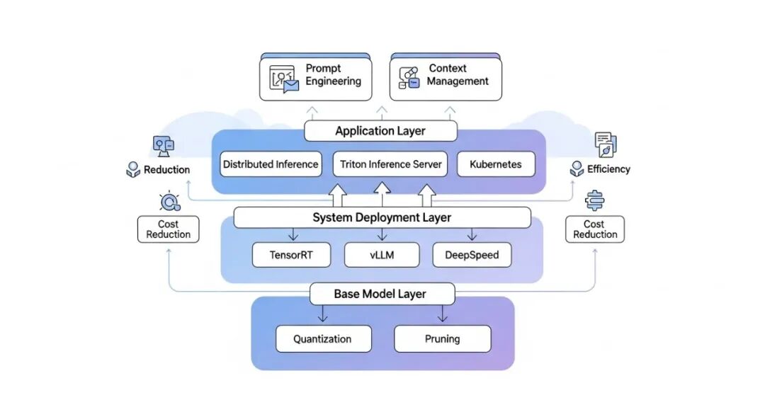 A layered architecture diagram showing enterprise LLM inference optimization, from base model (quantization, pruning) to inference engine (TensorRT, vLLM, DeepSpeed) to system deployment (distributed inference, Triton Inference Server, Kubernetes) and application (prompt engineering, context management). Arrows indicate data flow and optimization impact, with a focus on cost reduction and efficiency.