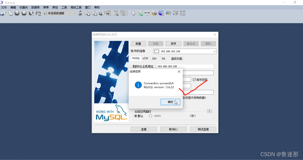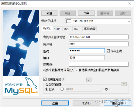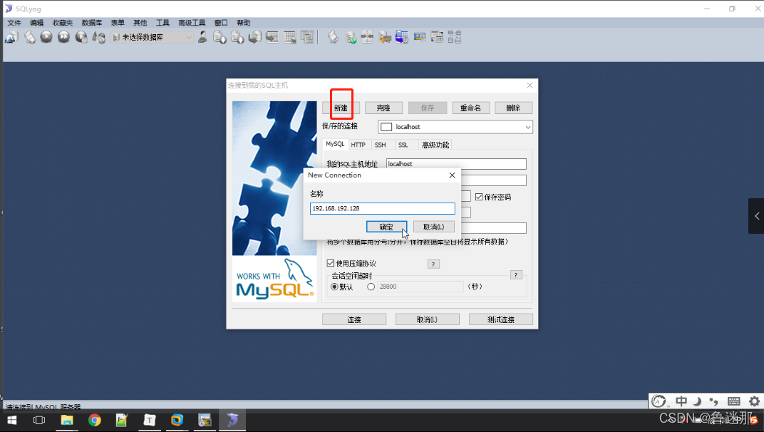 打开SQLyog,新建一个连接,然后指定连接192.168.192.128,确定