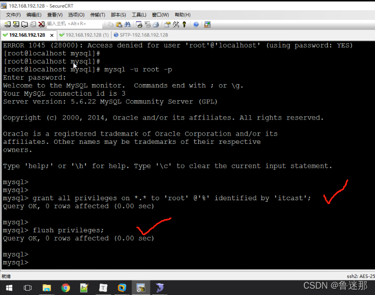 授权远程访问 : grant all privileges on *.* to 'root' @'%' identified by 'itcast'; flush privileges